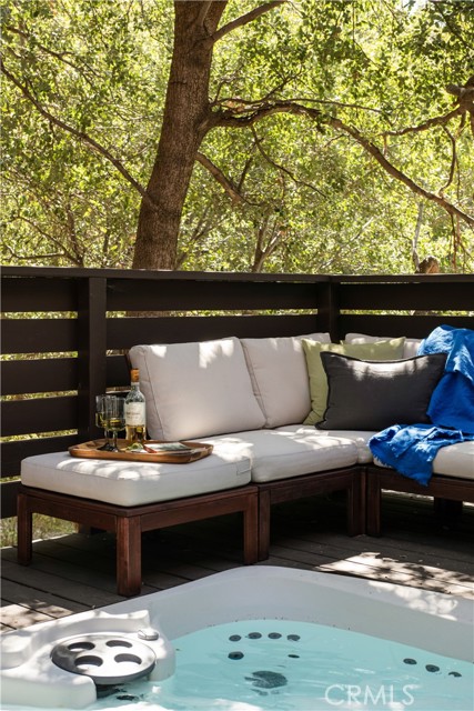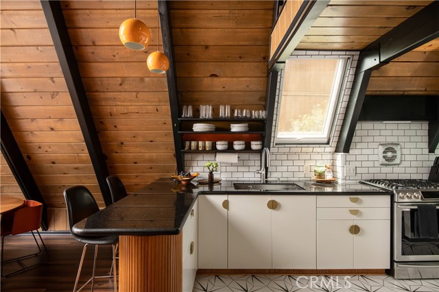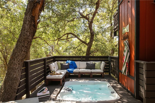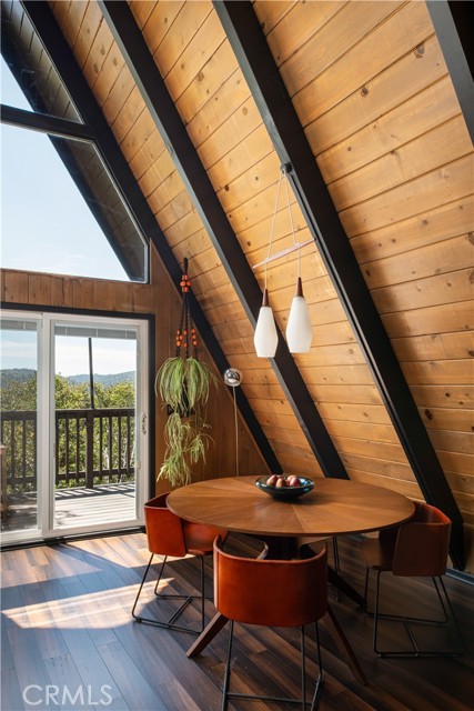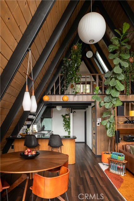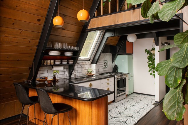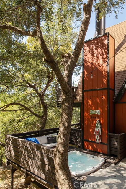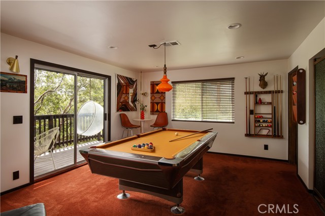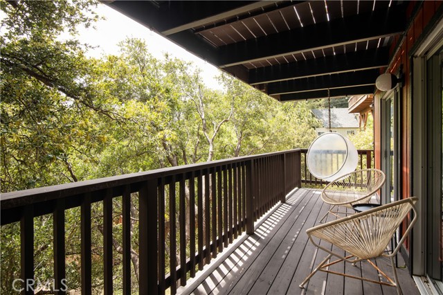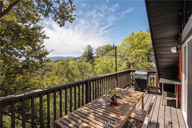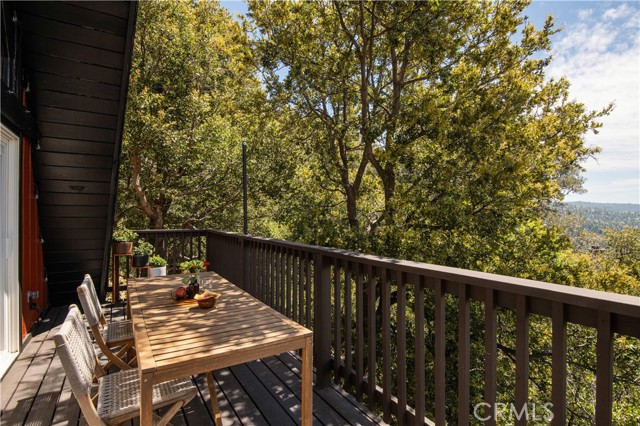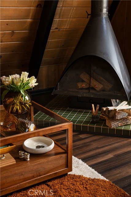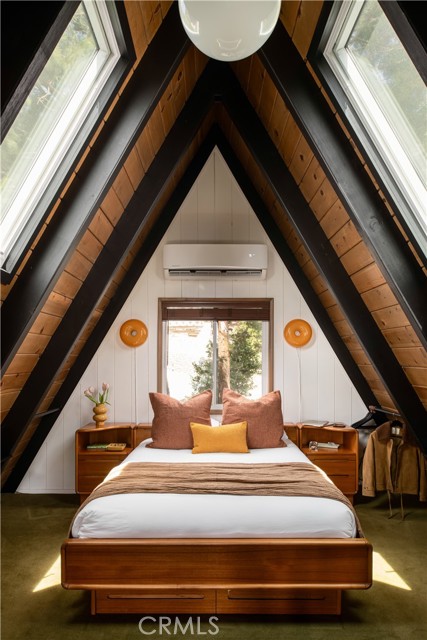 A true 1970s double A-frame, kept to its original intended design and set facing open views of expansive forest ridgeline and amenities nearby. Bold architectural lines and floor-to-ceiling windows create a seamless connection to the surrounding landscape. A dramatic wall of windows anchors the main living space, where an iconic Malm wood-burning fireplace serves as both a focal point and design statement. The interiors remain true to the era, with vintage-inspired tile, period lighting, and a cohesive material palette that feels both intentional and unique. A refined, design-forward spa-like bath enhances the home’s elevated aesthetic, while the upgraded kitchen—featuring a skylight—invites natural light and adds a fresh, modern contrast to the vintage character. The home offers 2 bedrooms and 2 bathrooms, along with an expansive lower level designed for gathering. This bonus space functions as a game and pool room, complete with its own fireplace, laundry, and direct access to a private deck and jacuzzi, set quietly among mature oak and pine trees. Above, the lofted bedroom is a standout—framed by two skylights and offering breathtaking views, natural light throughout the day, and a sense of openness that defines the upper level. A mini-split system provides efficient heating and cooling. Outdoor living begins with a large front deck leading to the entry, complemented by landscaped grounds on drip irrigation, a storage shed, easy access, and ample parking. A backup generator adds an extra layer of practicality and peace of mind. Located near Lake Arrowhead Country Club, with Lake rights and access to Lake Arrowhead amenities, the property is further distinguished by its setting—backing to the national forest and near Tunnel 2 Trail, offering a rare sense of privacy surrounded by nature. Lovingly maintained by full-time owners, the property has also gained recognition as a successful short-term rental and a sought-after setting for brand and editorial photoshoots—drawn to its distinct architecture and atmosphere. A rare offering where mid-century design, mountain living, and timeless character come together in one cohesive retreat.