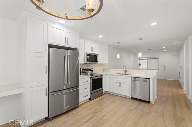 A beautifully reimagined two-bedroom, two-bathroom single-level home with no one above or below. This residence has undergone a complete transformation, fully permitted with the city and county, including asbestos removal and an updated floor plan for peace of mind. As you enter, you are immediately greeted by an open-concept design with a spacious living room flowing seamlessly into the dining area and gourmet kitchen. The kitchen has been thoughtfully upgraded with quartz countertops, a travertine stone backsplash, custom cabinetry, stainless steel appliances, and a breakfast island that makes it ideal for casual dining. Natural light fills the home with two solar tubes in the dining room, one in the master bath, and a generous skylight in the guest bedroom. Throughout the interior, you’ll find wood flooring, crown molding, recessed lighting, and designer finishes that create both warmth and elegance. Additional features include an indoor washer and dryer, a newer water heater with storage cabinet at the entry, and a spacious private patio perfect for enjoying your own garden. Every detail of this home has been redone from top to bottom, saving you the six months to one year it typically takes to draw plans, secure permits, and complete a remodel of this caliber. Don’t miss the opportunity to own a modern, move-in ready home in Laguna Woods—a true “Home Sweet Home.”