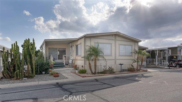 3 Bedroom 2 Bath doublewide 55+ Senior Community at Arroyo Fairways-resort-like living! Arroyo Fairways has many amenities to offer including free use of the 9-hole par 3 golf course, clubhouse, full kitchen facilities, swimming pool/spa, BBQ area, horseshoes, dog run, bingo, shuffleboard, gaming tables, billiards, different activities hosted by the park. Wonderful grounds maintenance keeps the park immaculate! This Park is surrounded by the breath-taking views of the San Jacinto and Idyllwild Mountains. Home is tucked back in a quiet location. Two full length awnings provide shade while allowing an abundance of natural light in! Upon entry you will be greeted with a warm and inviting atmosphere. Living room focal wall ready-wired for your entertainment needs. Other improvements include upgraded kitchen cabinets with pullout drawers, new Formica countertops, laminate flooring throughout (no carpet), remodeled hall bathroom with walk-in shower, roof coating installed 2024, newer energy efficient windows in living room/dining room. Appliances include oven/range, microwave, refrigerator, freezer, washer and dryer. Spacious primary bedroom with large closet. Primary bathroom has ample cabinet space, separate shower and bathtub. Two nice size secondary bedrooms. Dedicated laundry room includes washer, dryer and above shelving with direct access to the carport, two big sheds in the back of the home for extra storage. Minutes to medical facilities, shopping, eateries, movie theater, the famous Ramona Pageant, Soboba Casino Resort for some entertainment outings! If you are looking for comfortable affordable living look no further! Call for your private showing!